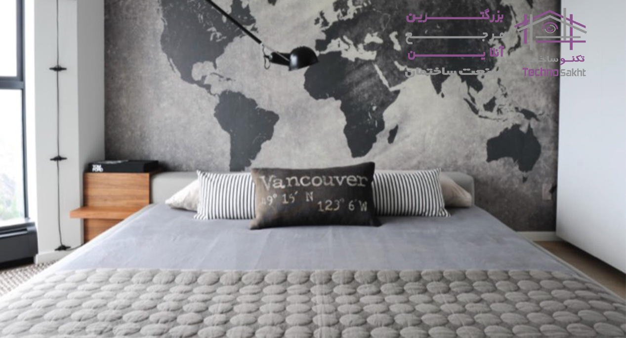 طرحی از نقشه جهان به صورت بی رنگ و با تم خاکستری حال و هوای این اتاق خواب ساده را متمایز کرده است.