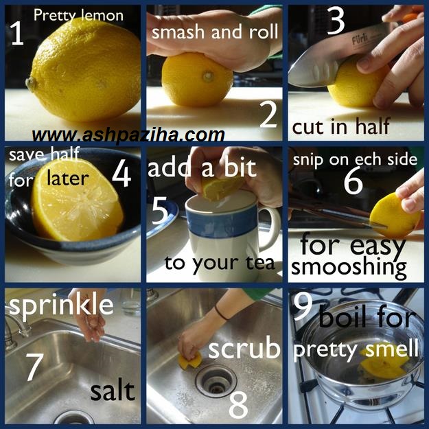 یک لیموی کامل را آورده، اول کمی اونو مالش داده و رول دهید. بعد با چاقو از وسط به دو نیم تقسیم کنید. یک نیمه را برای بعدا نگهداری کنید. این یکی نیمه رو برداشته اول چند قطره از اونو داخل لیوان چایتون بچکانید. با قیچی دو طرف اونو کمی برش بدید تا راحتتر در درست قرار بگیره. داخل سینک رو کمی نمک بپاشید و بعد لیمو رو همانطور که در شکل می بینید، روی سطح نمک پاشیده شده، بمالید. حالا می تونید باقیمانده اون رو هم بجوشونید تا یک بوی عالی و مطبوع در فضای خونه ایجاد کرده باشید.