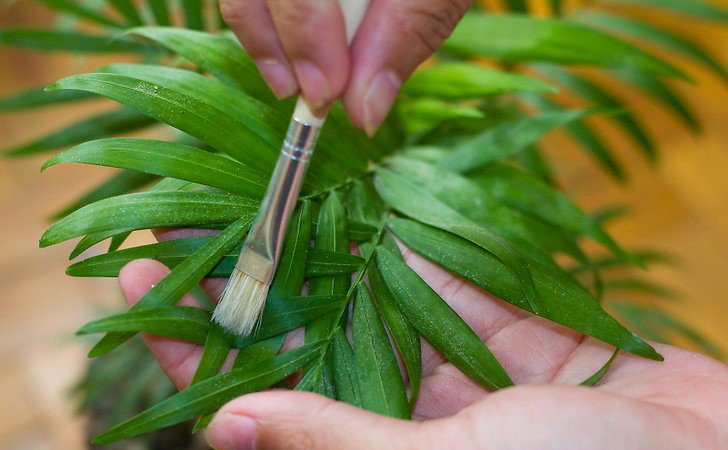 از بین بردن گرد و غبار و پاک کردن برگ ها در ساده ترین راه با استفاده از پارچه تنظیف، دستمال نازک توری یا حوله کاغذی مرطوب انجام می شود. مراقب باشید حین تمیز کردن، برگ ها با فشار زیاد دست دچار آسیب و شکستگی نشوند. یکی از مواد تمیزکننده و مؤثر در این روش مایع ظرفشویی